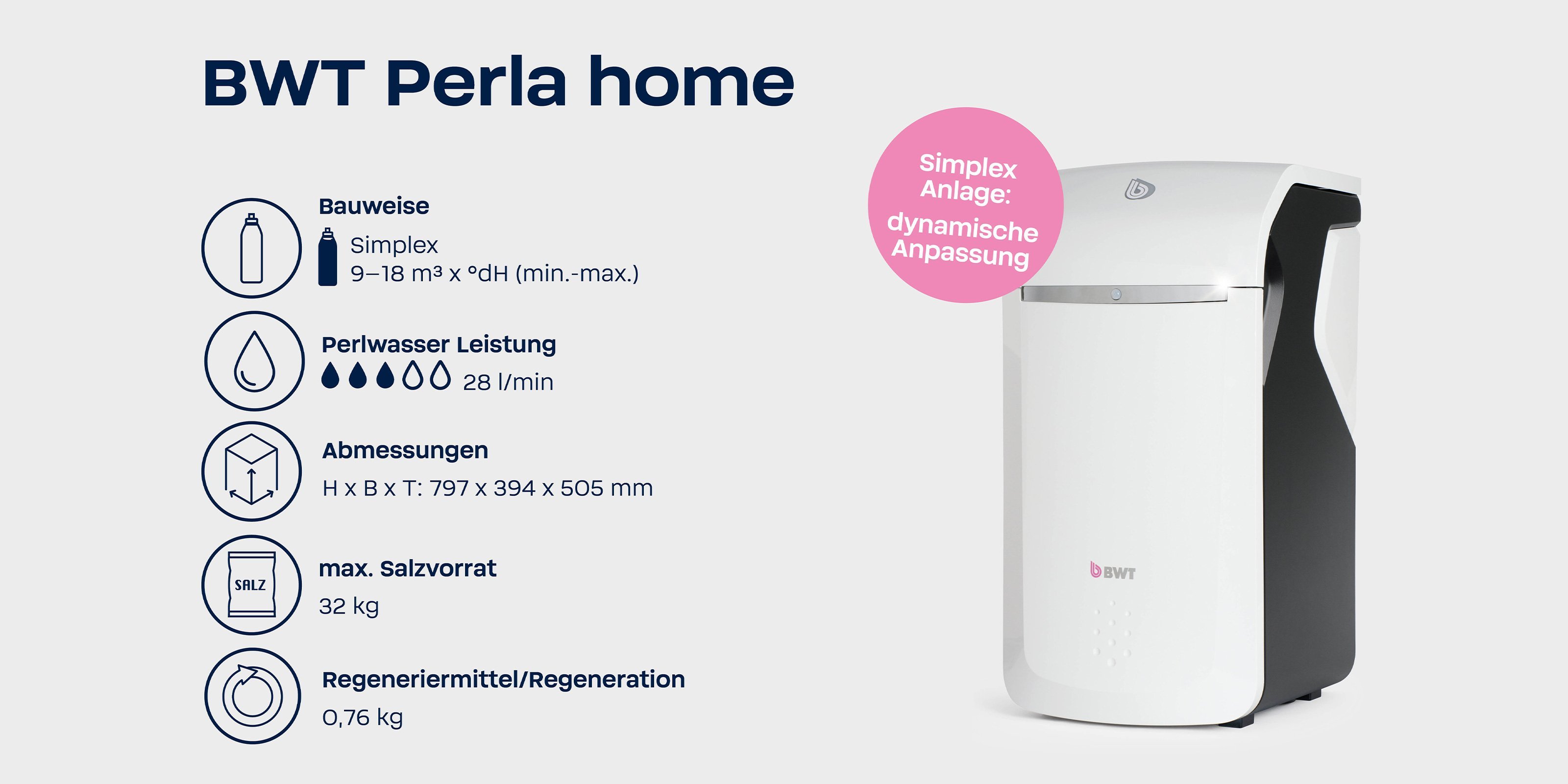 Die Enthärtungsanlagen von BWT verwandeln selbst sehr hartes Wasser in seidenweiches Perlwasser, das im gesamten Haus zur Verfügung steht. Je nach Modell sorgen Simplex- oder Duplexsysteme dafür, dass auch bei höherem Wasserbedarf jederzeit aufbereitetes Wasser zur Verfügung steht.