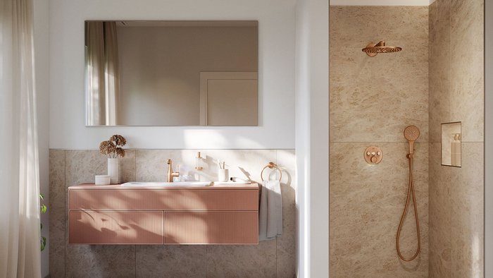 Warme Kupfertöne dominieren bei Warm Sunset: Der Roségoldton verleiht dem Bad eine einladende, fast schon atmosphärische Wärme. Er lässt sich besonders gut mit natürlichen Materialien wie dunklem Stein, Marmor oder Beton kombinieren – so entsteht ein Design, das gleichermaßen modern wie zeitlos wirkt.